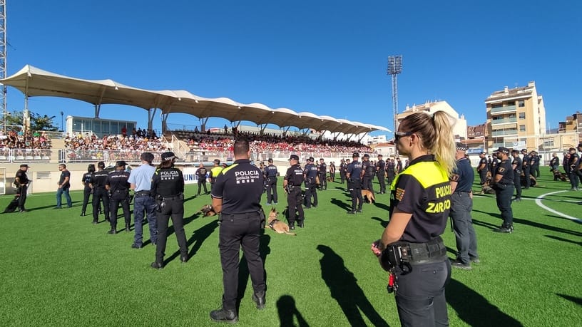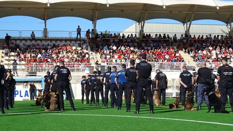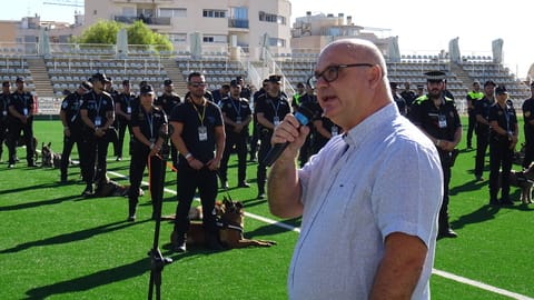 El curso de seguridad ciudadana y unidades K-9 ha dado comienzo con el recibimiento por parte del alcalde de la Vila Joiosa, Andreu Verdú; la concejala de Seguridad Ciudadana y Tráfico, Isabel Perona; y el Intendente Jefe de la Policía Local de la Vila Joiosa, José Álvarez; a todos los agentes de las fuerzas y cuerpos de seguridad participantes de estas jornadas, instructores y asistentes, en un acto de inauguración que ha tenido lugar en el Estadio Municipal ‘Nou Pla’, y que ha contado para la ocasión con una grada repleta de alumnos y alumnas de los diferentes centros de educación pública de la Vila Joiosa, que han respondido positivamente a la invitación de Policía Local para la puesta de largo de este curso.