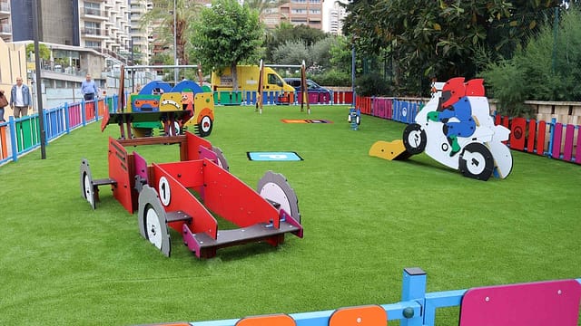 La temática es de parque móvil con columpios para los más pequeños, muelle, coche accesible, panel interactivo, camión, tobogán moto… y todo ello sobre una base amortiguadora y césped artificia con figuras impresas sobre el mismo.