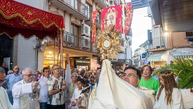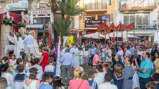 Tras los niños, el ‘Santísimo Sacramento’ bajo palio portado por el sacerdote y el ángel, papel intepretado por la niña Paula Fuentes Amor. Detrás, las autoridades locales, encabezadas por el alcalde, Toni Pérez, y el concejal de Fiestas, Jesús Carrobles. Por último, la Unión Musical de Benidorm que interpretaba las marchas ‘Triunfal’ y ‘Pescador de hombres’.