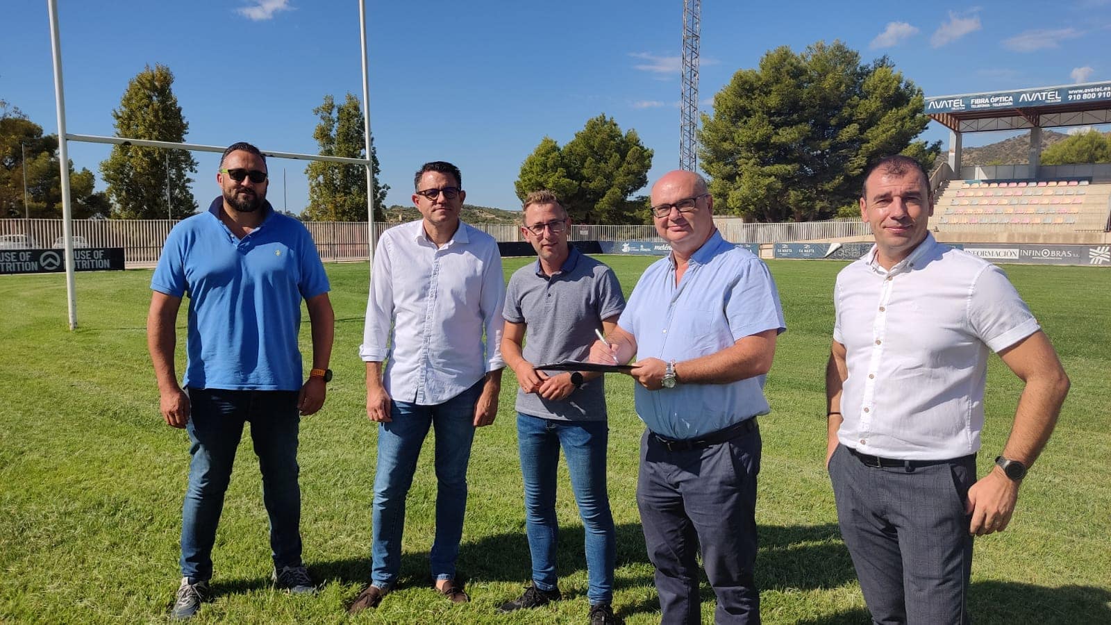 La Vila Joiosa, 16 de septiembre de 2022. El alcalde de la Vila Joiosa, Andreu Verdú, y el concejal de Deportes, José Ramón Uclés, junto a técnicos municipales y responsables de la empresa adjudicataria de las obras, se han desplazado esta mañana hasta el estadio municipal de rugby de ‘El Pantano’ de la Vila Joiosa para firmar el acta de recepción de obra de los trabajos de mejora del terreno de juego de hierba natural.