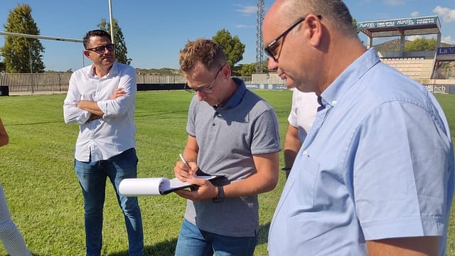 La Vila Joiosa, 16 de septiembre de 2022. El alcalde de la Vila Joiosa, Andreu Verdú, y el concejal de Deportes, José Ramón Uclés, junto a técnicos municipales y responsables de la empresa adjudicataria de las obras, se han desplazado esta mañana hasta el estadio municipal de rugby de ‘El Pantano’ de la Vila Joiosa para firmar el acta de recepción de obra de los trabajos de mejora del terreno de juego de hierba natural.