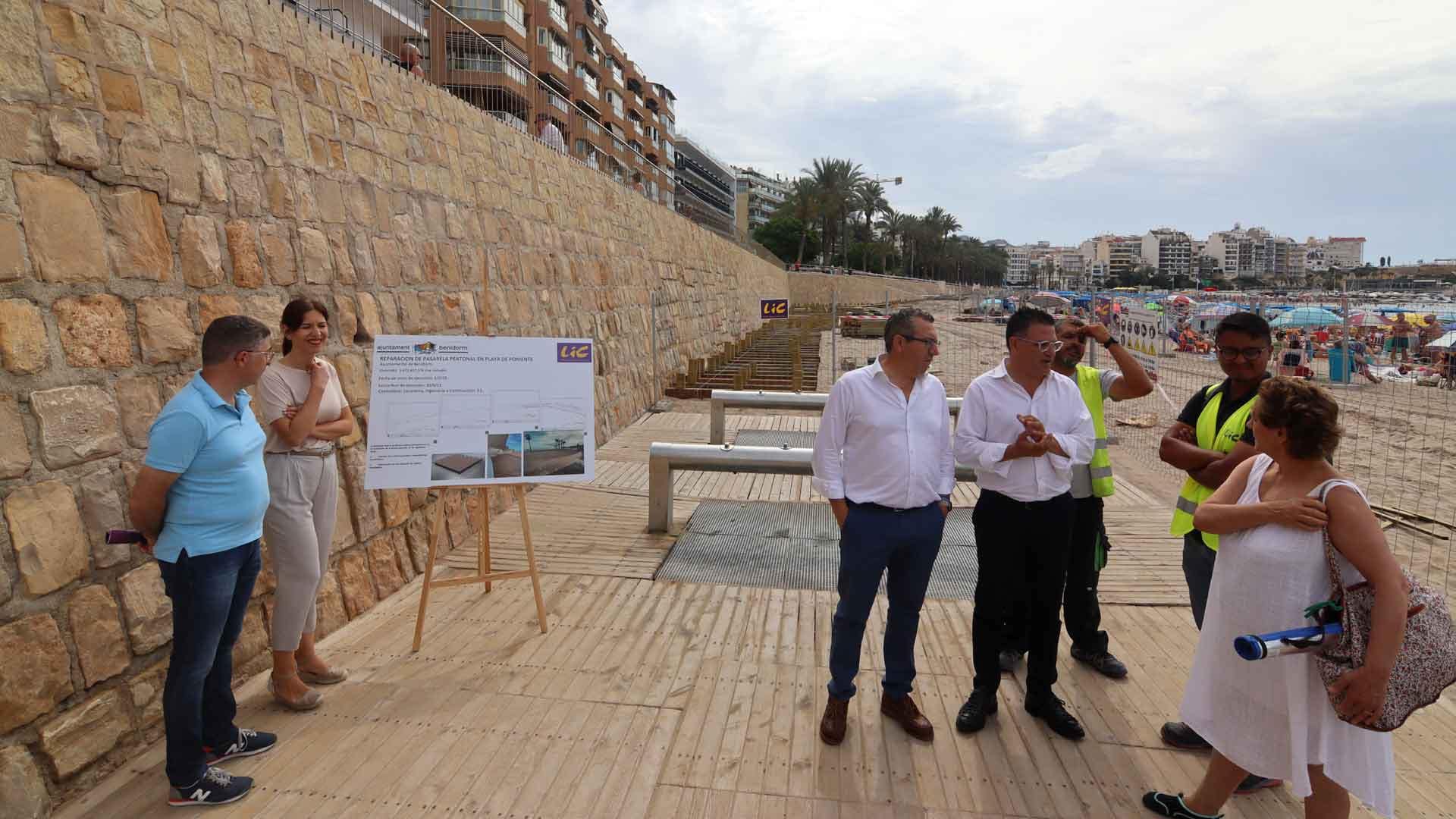 La nueva pasarela peatonal de la playa de Poniente llegará hasta el Paseo de Colón, ampliando en más de 300 metros lineales la superficie que ocupaba la anterior. Así lo ha trasladado hoy el alcalde, Toni Pérez, que junto a los ediles de Espacio Público y Playas en funciones, José Ramón González de Zárate y Mónica Gómez, ha visitado la playa para comprobar cómo avanzan las obras, que estarán completadas a finales de este mes.