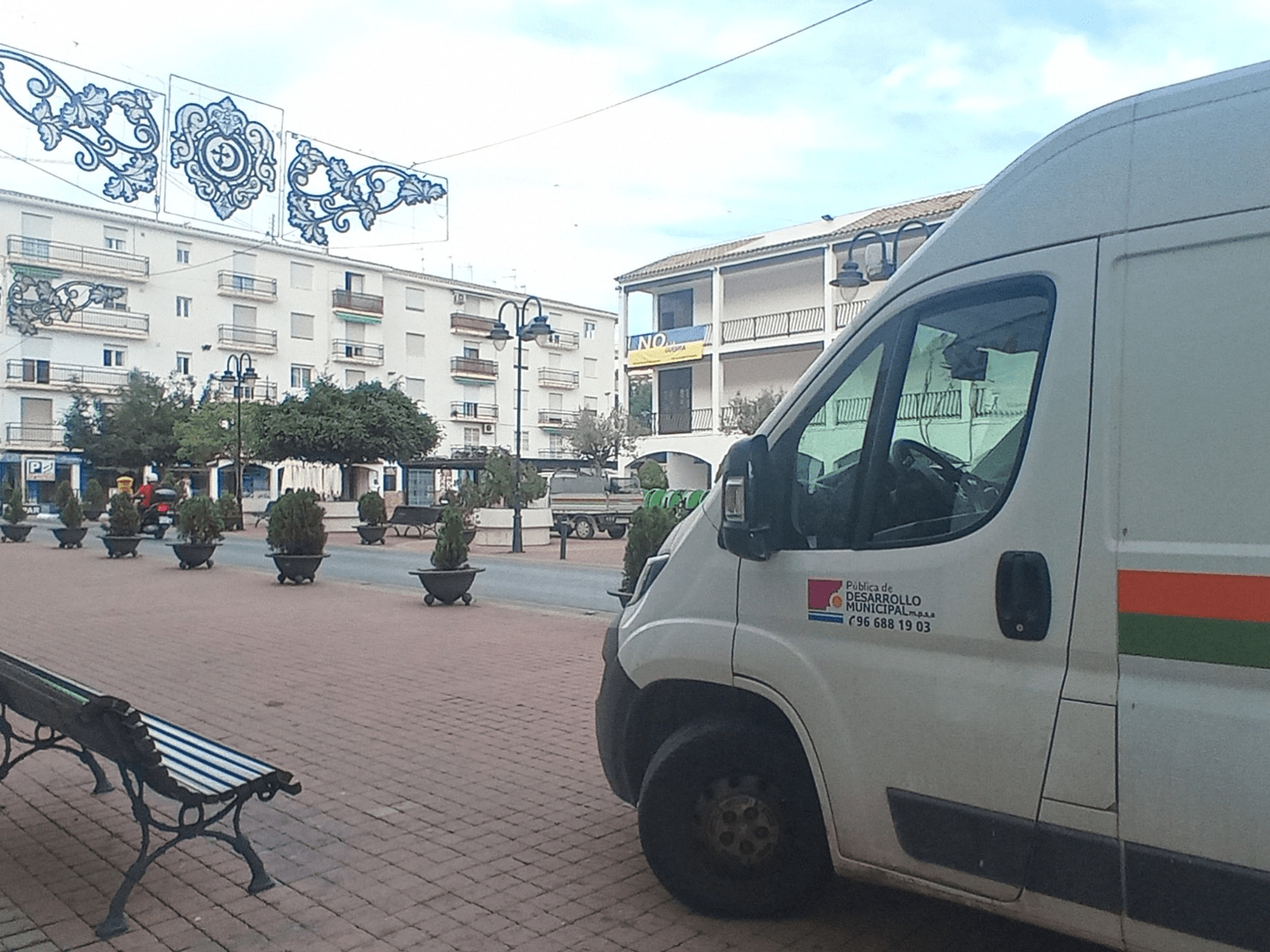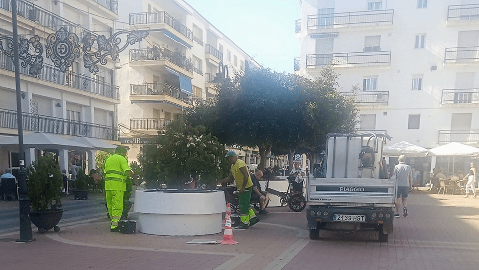 Los Servicios Técnicos de La Pública se están encargando durante estos días de mover diferentes ornamentos debido al itinerario previsto de diferentes actos, es el caso de maceteros, papeleras, bancos etc.