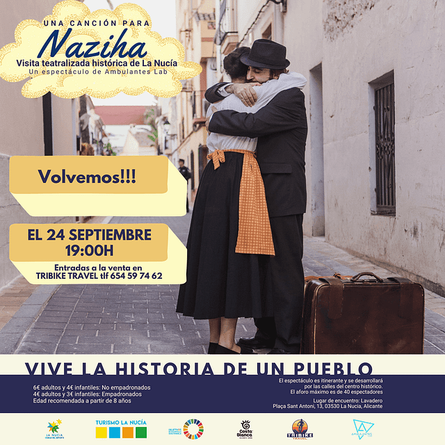 La quinta visita teatralizada será el sábado 24 de septiembre a las 19 horas desde el “Llavador” de La Nucía. “Una canción para Naziha” es una forma diferente de descubrir los rincones con encanto de La Nucía y su historia. Una dinámica visita de una hora por el casco antiguo para toda la familia. Las reservas pueden realizarse ya en la agencia de viajes de La Nucía “Tribike Travel” (654 59 74 62).