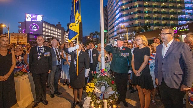 La enseña de la Royal British Legion, como indica el protocolo británico, se inclinó con el toque de corneta que anunciaba el duelo y los asistentes guardaron tres minutos de silencio. A continuación, la ‘Union Jack,’ la bandera del Reino Unido, bajó en señal de duelo para volver a ser izada hasta los tres cuartos del mástil y sonó su himno nacional, ya renombrado: God Save The King.